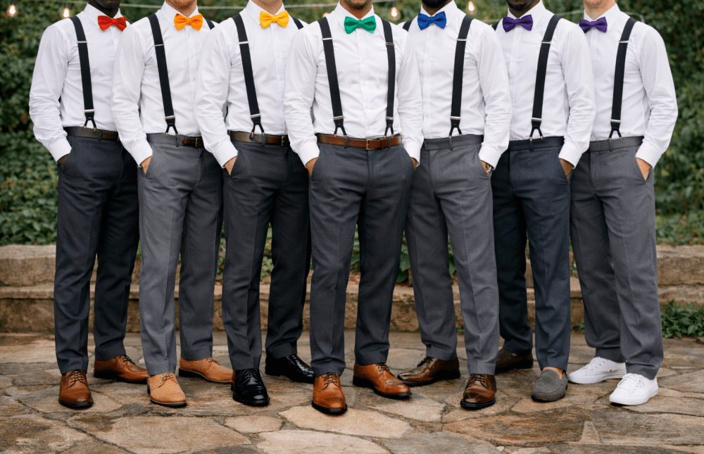 Padrinhos podem ir com uma calça cor chumbo ou cinza, camisa branca, suspensório e gravata borboleta da cor escolhida. Sapato livre.